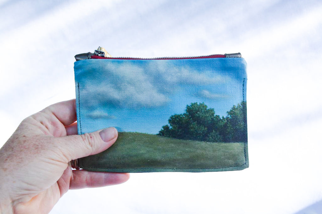 A cute purse made with a beautiful oil painting by artist Catriona Secker. It has a soft brown leather back, with top-stitched detail.